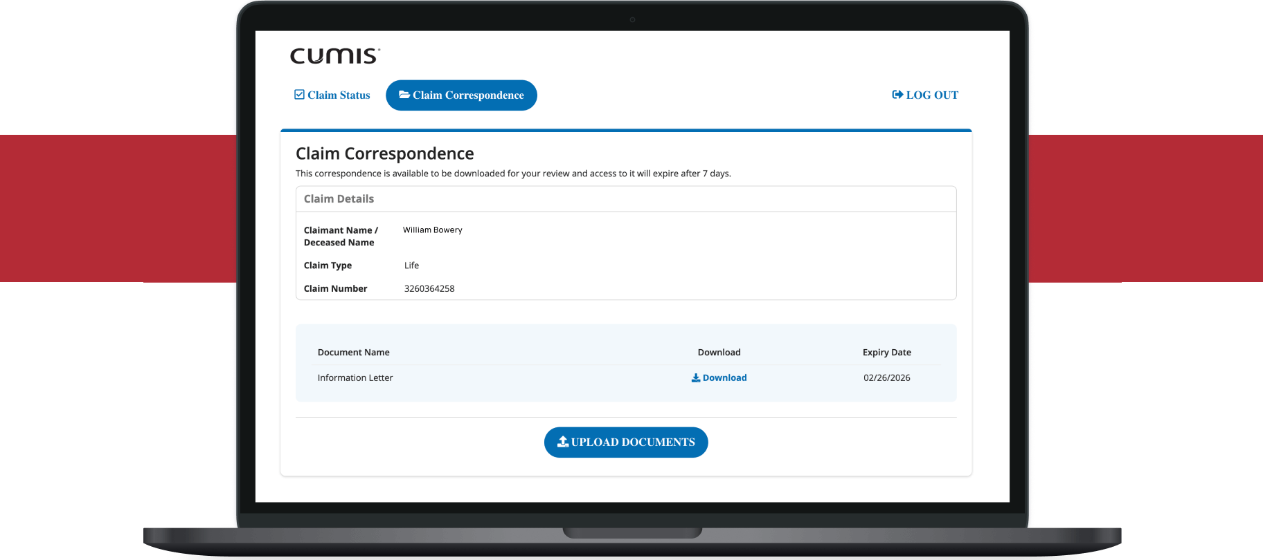 Once you have submitted your claim and have entered an existing claim number, select the “Claim Correspondence” tab from the top of the screen to view any correspondence related to your claim.