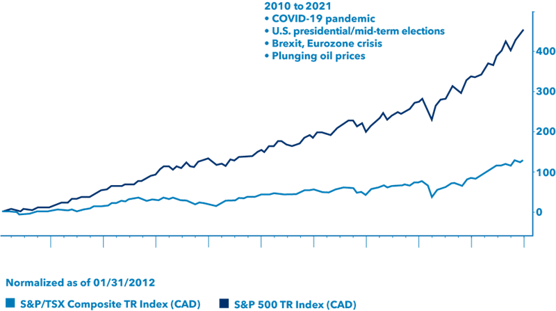 Le graphique ci-dessous met en évidence les principaux événements mondiaux qui ont secoué les marchés financiers au cours de la dernière décennie, et la réaction des marchés dans les années qui ont suivi. Au cours des deux années les plus récentes seulement, de 2020 à 2022, les investisseurs et investisseuses ont été témoins d’un effondrement historique du marché, suivi d’une reprise sans précédent, qui a laissé la place à une période de volatilité imprévisible, marquée par les rendements erratiques alimentés par l’inflation, la guerre et les problèmes de chaînes d’approvisionnement mondiales. Rien ne permet de garantir le rendement futur, cependant les données ci-dessous montrent que l’indice composé S&P/TSX du Canada et l’indice S&P 500 ont poursuivi leur tendance à la hausse.